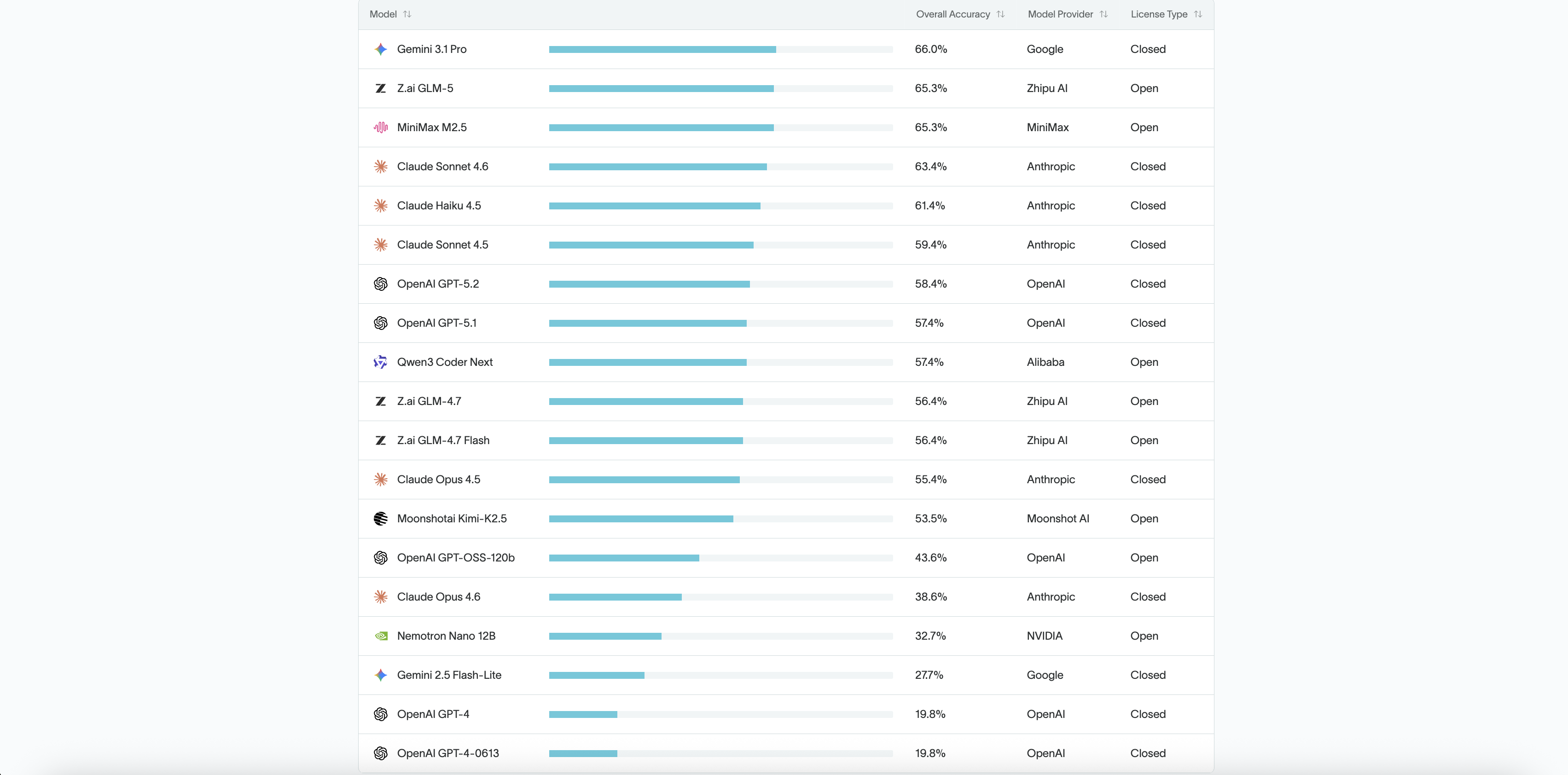 The top-performing model, Gemini 3.1 Pro, achieved an accuracy score of 66.0%. The lowest, GPT-4 and GPT-4-0613, scored just 19.8%.