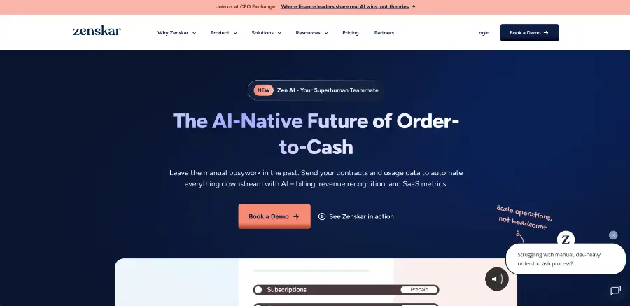 Zenskar is an AI-native order-to-cash system that automates billing, revenue recognition, collections, and SaaS metrics for modern finance teams.