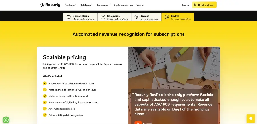 Recurly offers custom pricing for its revenue recognition modules based on contract volume and feature tiers.
